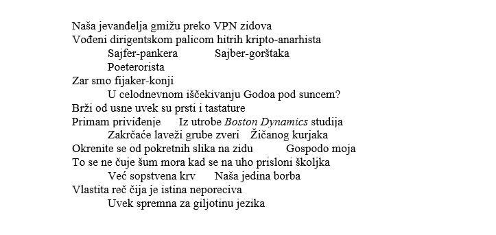 Pesma nikad nije samo tekst na papiru ili ekranu, ona je propraćena atonalnom muzikom, iskasapljenim semplovima iz Arturia Pigments-a koji su uz Paulstretch plugin razvučeni do beskonačnosti, mešavinom zvuka sintisajzera daleke budućnosti (zapravo u pitanju je hor žičanih kurjaka koji će tek nastati) i melodije ciganske violine.